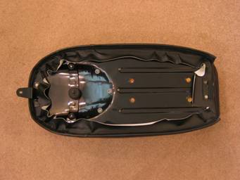 Here’s what the seat mounting looks like, it uses the original Harley fastener on the rear fender, bears most of its weight on the rear fender via rubber stops, and slides into the tank bracket on the front: