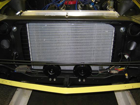 The temperature probe with the fan is meant to push through the radiator fins, but they are too close on this radiator to allow that. So I wire-tied it to the rear of the radiator, on the upper driver’s side, and that seems to work fine.
