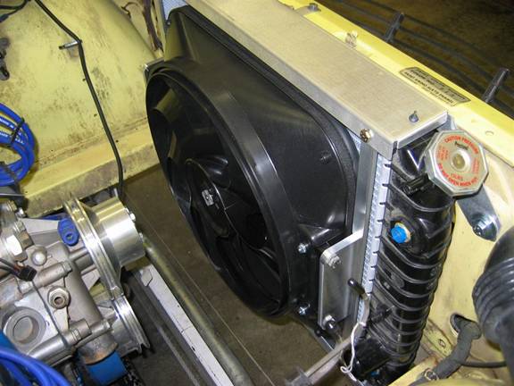 I machined some aluminum brackets to mount the fan to the radiator, rather than use the ones provided with the fan. I think these have a little nicer appearance than those provided with the fan. In this picture, you can also see the top center bracket that makes everything much more rigid: