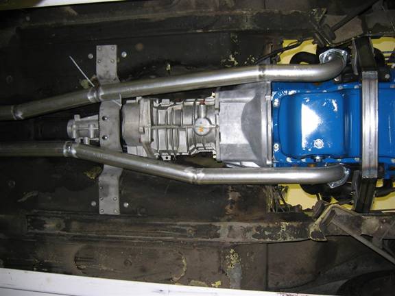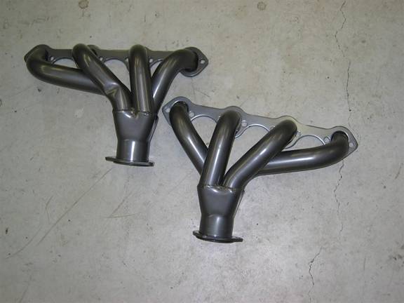 You can see the indent in the driver’s side pipe to give a little clearance for the steering shaft. In reality, it’s not as severe as it looks in the picture. Maybe a quarter inch deep. It was made by heating the pipe with a torch, then holding a piece of pipe against the header at the desired angle and giving it whack with a hammer. Pretty sophisticated! If you buy the pipes new that are ceramic coated (cheaper then having them done later), it’s questionable whether you can put this indent into them without damaging the finish.