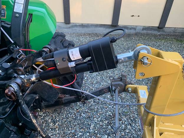 The linear actuator has an 8” stroke and was the right length after I machined some Heim joints to fit on each end. Oddly, the actuator was slightly different on each end. I used the correct size for a Cat-II hitch, but it can be used on a Cat-I hitch with a bushing at each end. So, it should work on about any size tractor, long as it isn’t asked to move more than a ton of implement weight.